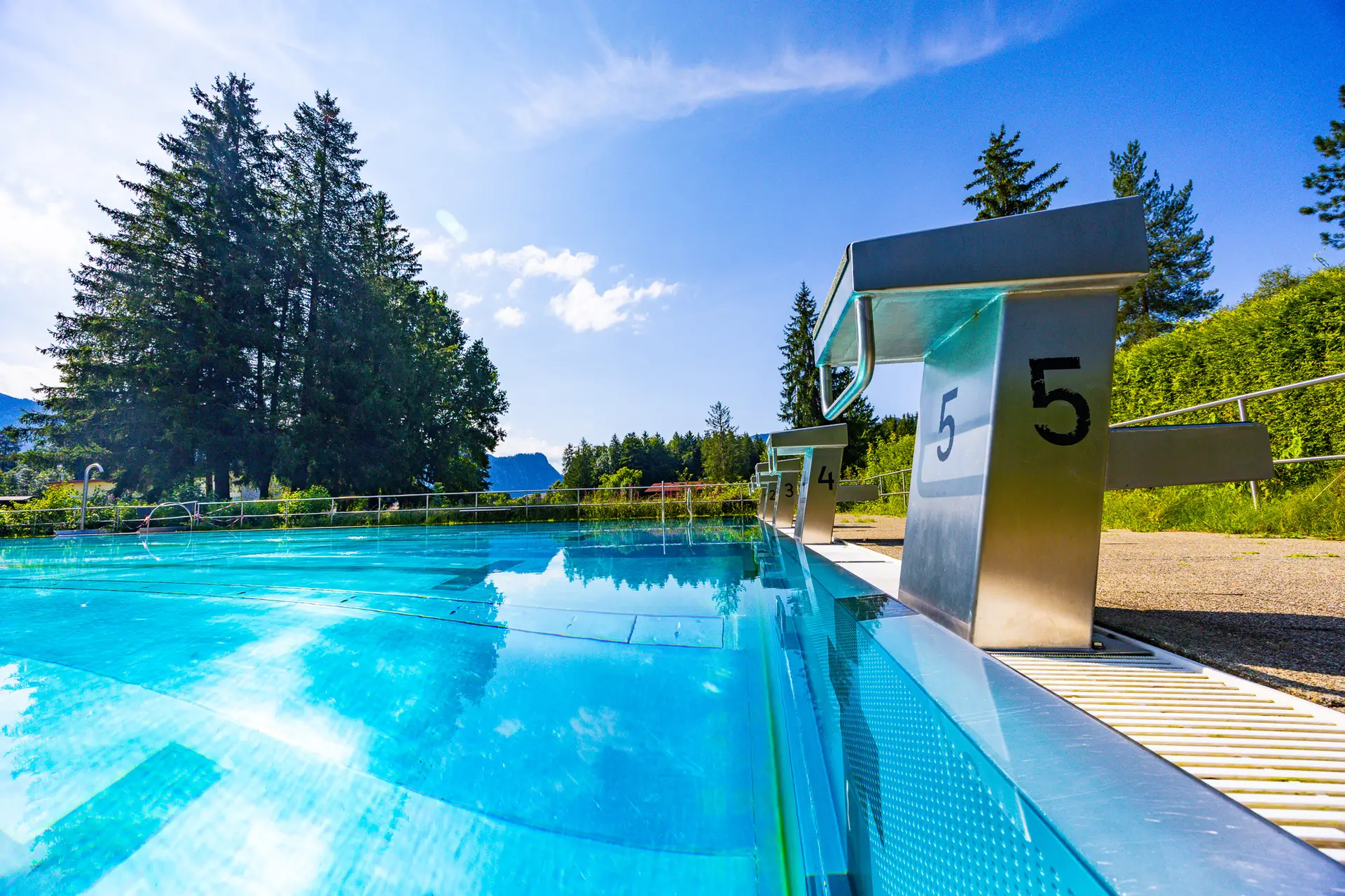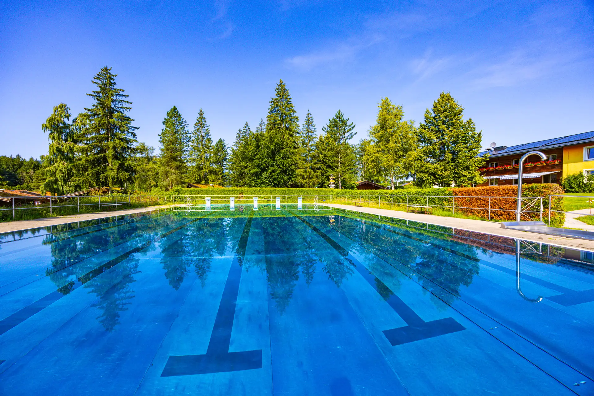 Unser 25-Meter-Solarbeheiztes Freibad bietet die perfekten Voraussetzungen für erholsames Schwimmen und intensives Training. Durch die umweltfreundliche Solaranlage wird das Wasser konstant auf eine angenehme Temperatur von 20 bis 24 Grad Celsius beheizt, je nach Sonneneinstrahlung.