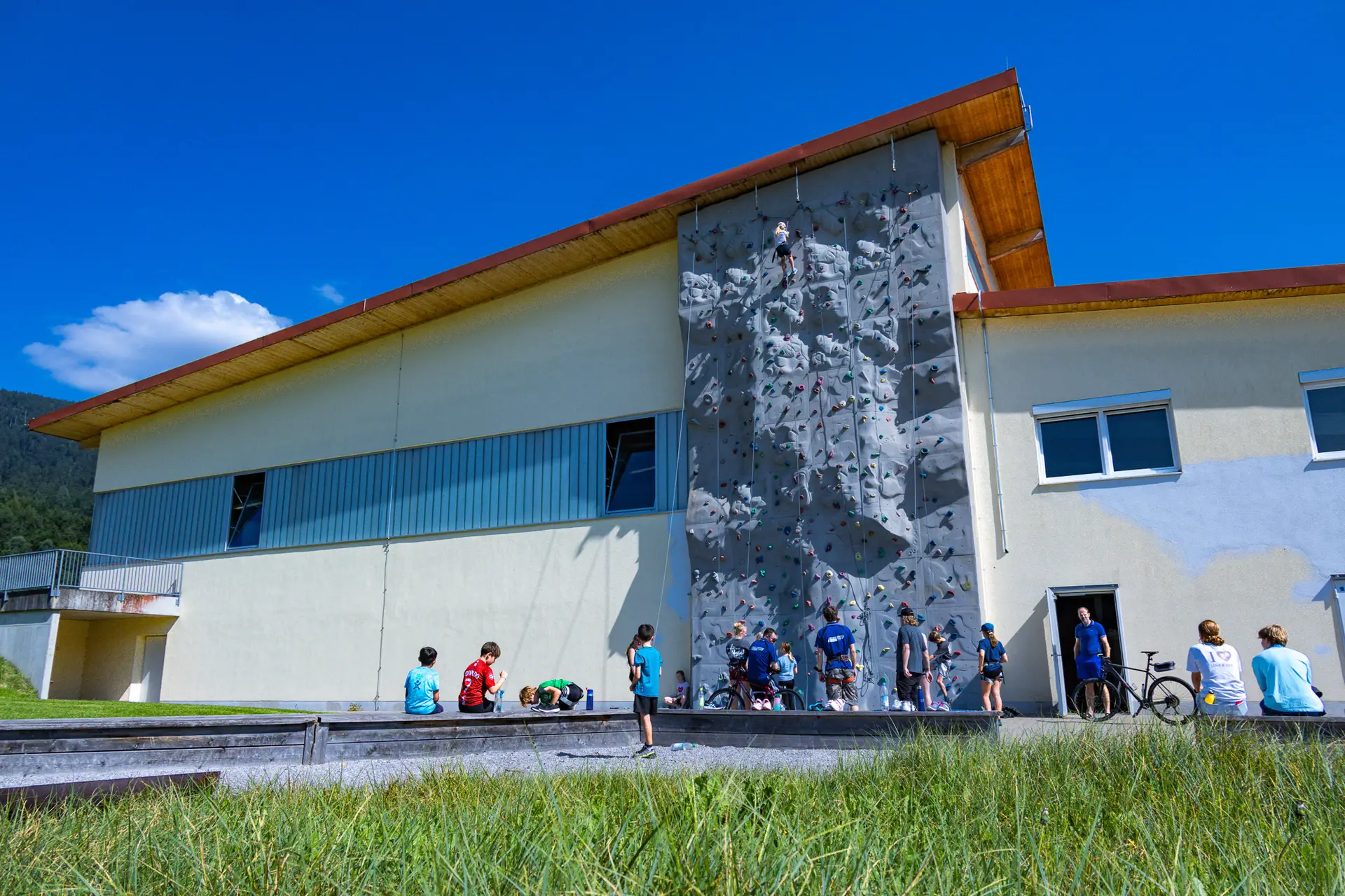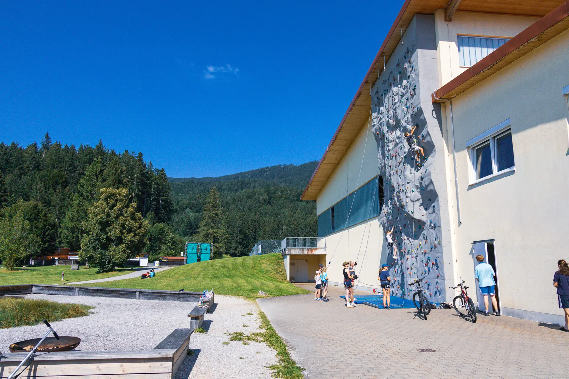 Direkt im Außenbereich befindet sich eine weitere 14 Meter hohe Kletterwand, die das Klettererlebnis inmitten der Natur ermöglicht. Sie bietet verschiedene Routen und Schwierigkeitsgrade und ist besonders bei schönem Wetter ein Highlight für unsere Gäste.