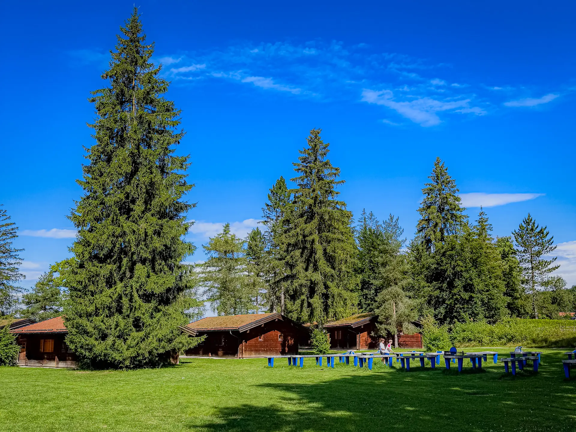 Die Anlage liegt direkt auf dem Außengelände, umgeben von Wiesen und mit Blick auf die Berge – frische Luft inklusive.