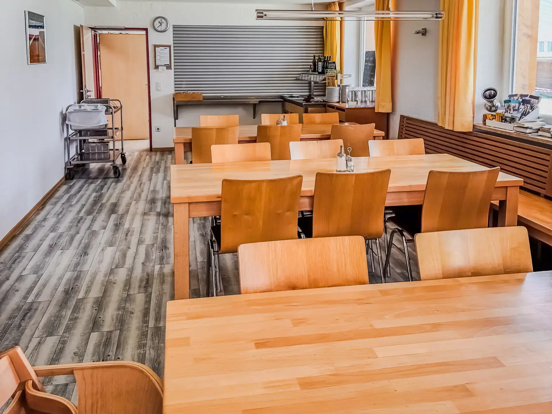 Unser großer Speisesaal fasst bis zu 280 Personen und ist ideal für große Gruppen, Schulklassen, Vereine und Veranstaltungen. Hier servieren wir täglich Vollpension – Frühstück, Mittag- und Abendessen – in Buffetform. Wir legen großen Wert auf ausgewogene und gesunde Kost, mit Varianten wie vegetarisch, vegan, glutenfrei oder ohne Schweinefleisch auf Anfrage. Der Speisesaal ist hell, freundlich und lädt ein zum Verweilen und Austausch.